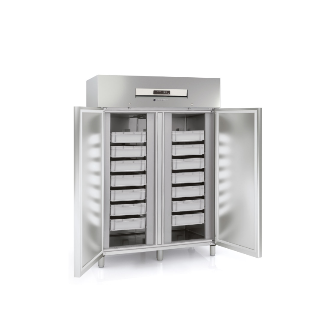 - Interior con guías de acero inox, regulables en altura cada 60 mm para