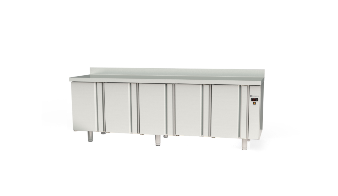 • Plan de travail en acier inox AISI-304 avec façade droite et dosseret sanitaire de 100 mm (en option sans dosseret)